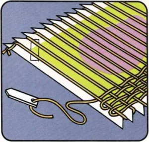 Materials – blunt needle – cardboard (stiff) – crayons or felt-tip pens – fork or comb – paper (blank) – scissors – stick needles (three or more) – string – yarn (two or more colors) A…